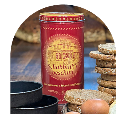 Schabbink’s beschuit. Al drie generaties bros en krokant. Met een vleugje zoet en zout en net een maatje groter. Het recept is sinds 1938 verfijnd door de ambachtelijke bakkers van Schabbink. In hartje Twente waar beschuit traditiegetrouw ook bij de koffie wordt geserveerd. In Twente worden beschuiten ook twiebak genoemd. De woorden geven aan dat ze twee keer de oven ingaan. De eerste keer in speciale bakvormen of doppen. Goed afgekoeld worden de beschuitbollen door gesneden. In de oven krijgen ze daarna de juiste brosheid en kleur.